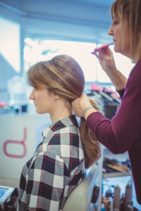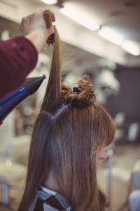 Antes de realizar un recogido es muy importante preparar el cabello a conciencia. En este caso queríamos conseguir un pelo con volumen y, sobre todo, con un aspecto muy natural. Lo primero que hicimos fue aplicar un matiz de color para retocarlo y potenciarlo antes de comenzar con el lavado. Una vez que el color estaba listo, aplicamos el baño y el champú de la gama de productos Volumifique de la marca Kérastase, que son específicos para aportar volumen y ligereza al cabello. Para terminar utilizamos el gel en spray Matérialiste, también de Kérastase, que sirve para engrosar la fibra capilar.