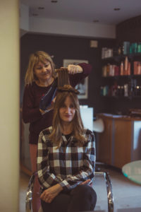 Para la realización del peinado de Cris nos inspiramos en la estética de una rasta. Pero uno una rasta cualquiera, sino una muy pulida y elegante. El primer paso es la realización de una coleta que sujetamos con una goma de pelo. Hay que destacar que este es el único punto firme de sujeción del recogido ya que una vez que realizamos la forma de la rasta con las manos, cosimos el pelo con hilo transparente. De esta manera conseguimos un resultado mucho más natural que con horquillas. Et voilà…¿Qué os parece el resultado?