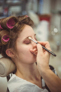 Para darle más volumen al cabello recogimos el pelo con rulos y aprovechamos el tiempo de reposo para realizar el maquillaje. Tuvimos claro desde el principio que queríamos un look muy natural para Cristina, sin embargo, pensamos que potenciar su mirada con sombras en tonos berenjenas sería todo un acierto. ¿Y porqué este color? Pues porque quedaba ideal con su vestido de novia…¡¡Cuando veáis las fotos del resultado entenderéis todo!!