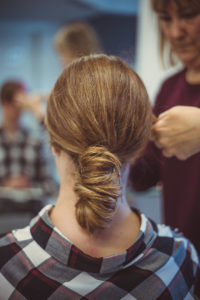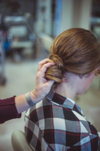 El primer paso es secar bien el pelo, trabajándolo con cepillo y levantando el cabello siempre desde la raíz. Lo más importante es ir dándole forma redondeada ya que queremos que el moño se adapte a la forma de la cabeza. Se trata de un recogido en la nuca con el que solo queda al descubierto la parte de los lóbulos de la oreja. De esta manera conseguimos que todavía resaltasen más los preciosos pendientes que lucía Cris.